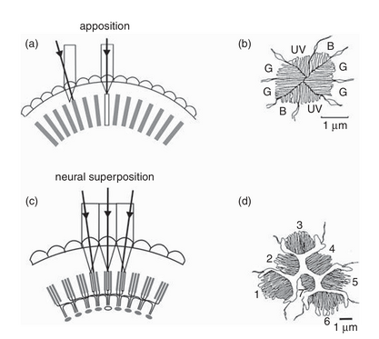 2. 双翅目苍蝇的情况略有不同:每个小眼中的倒置图像由七个独立的受体分辨。然而,这些反应在层状结构(第一突触层)中以汇集信号的方式组合在一起,从而提高了灵敏度,同时又不损失分辨率。就苍蝇而言,整体图像的形状和分辨率与传统的并置眼相同。这种排列被称为“神经叠加”。