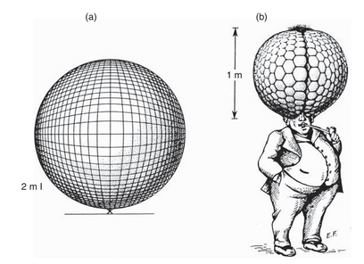 Mallock 的论文继续讨论了具有人类分辨率的复眼会是什么样子,他得出了一个惊人的结论:它的直径需要超过 20 米——比房子还大(图 7.7a​​)。原因很明显。人眼在白天瞳孔直径为 2 毫米时可实现 60 c/deg 的分辨率,这是蜜蜂晶状体直径的 80 倍。为了使蜜蜂具有相同的分辨率,衍射要求其所有晶状体都需要具有这种直径,并且为了利用场景中的所有细节,它们需要以 0.5 弧分角间隔排列,与我们中央凹中的受体相同。在球形眼中,小眼间角 (Δ ϕ) 是眼睛中心一个晶状体直径所对的角 (D / r 弧度,其中 r 是眼睛半径;图 7.1),得出 r = D /Δ ϕ。当 Δ ϕ = 0.5 弧分(0.000145 弧度)且 D = 2 毫米时,曲率半径将为 13.8 米,直径是其两倍。