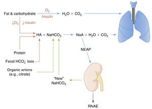 其他膳食成分的细胞代谢也会对酸碱平衡产生影响。例如,含硫氨基酸如半胱氨酸和甲硫氨酸在代谢时会产生硫酸,而赖氨酸、精氨酸和组氨酸的代谢则会产生盐酸。这部分非挥发性酸负荷的一部分通过天冬氨酸和谷氨酸的代谢产生的HCO3-来抵消。平均而言,膳食氨基酸的代谢会产生净的非挥发性酸。某些有机阴离子(如柠檬酸)的代谢会产生HCO3-,这在一定程度上抵消了非挥发性酸的产生。总体而言,在摄入含肉饮食的个体中,酸的生成超过了HCO3-的生成。相比之下,素食饮食产生的非挥发性酸较少。除了代谢产生的酸和碱外,摄入的食物中也含有酸和碱。例如,摄入食物中的磷酸盐(H2PO4-)会增加膳食酸负荷。最后,在消化过程中,部分HCO3-通常会随粪便排出。这种损失相当于向体内添加了非挥发性酸。在摄入含肉饮食的个体中,膳食摄入、细胞代谢和粪便中HCO3-的损失导致每天向体内添加约0.7至1.0mEq/kg体重的非挥发性酸(大多数成年人每天50-100mEq)。这种酸被称为净内源性酸生成(net endogenous acid production, NEAP)会导致体内HCO3-的等量损失,必须进行补充