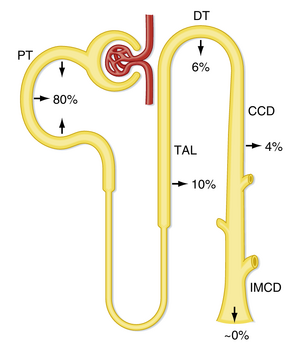 • 图37.2  HCO3-的节段重吸收。图中显示了肾单位各段对过滤的HCO3-重吸收的比例。通常情况下,过滤的HCO3-全部被重吸收,尿液中几乎没有或没有HCO3-出现。CCD,皮质集合管;DT,远端小管;IMCD,内髓集合管;PT,近端小管;TAL,厚升支。