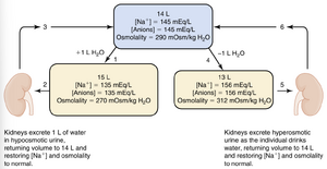 在可获得充足水分的情况下,口渴机制能预防高渗状态的发生。该机制可解释中枢性尿崩症(CDI)和肾性尿崩症(NDI)患者多尿引发的烦渴(polydipsia)现象。多数个体即使没有口渴感也会摄入水/饮料。正常情况下,肾脏可通过排泄高达18升/天的尿液来处理这些过量水分。然而在某些情况下,尤其是短时间内摄入的水量可能超过肾脏的排泄能力,此时体液将呈现低渗状态。