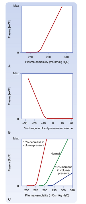 渗透压感受器(osmoreceptors)的激活与抑制成分通过协同作用形成阈值(threshold)或调定点(set point)。图35.4A展示了血浆渗透压(plasma osmolality)变化对循环中AVP水平的影响。该关系的斜率十分陡峭,反映了系统的敏感性。调定点指AVP分泌开始增加时对应的血浆渗透压值,低于此值时几乎不释放AVP。由于遗传因素对系统调定和敏感性的影响,不同个体中AVP达到最低有效浓度和最高有效浓度时对应的有效血浆渗透压绝对值存在显著差异。但AVP释放的平均调定点对应血浆渗透压为280mOsm/kg H2O,通常仅需升高2\%至4\%即可达到最大抗利尿效果。健康个体的调定点相对稳定,但妊娠、月经周期、雌激素水平升高或血压/血容量显著下降时可使其降低。妊娠期间调定点偏移的机制可能与某些激素(如松弛素(relaxin)和绒毛膜促性腺激素(chorionic gonadotropin))水平升高有关。