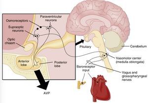 血容量或血压下降也会刺激AVP分泌。负责这一反应的感受器同时位于循环系统的低压侧(左心房和大肺血管)和高压侧(主动脉弓和颈动脉窦)。由于低压感受器位于循环系统的高顺应性侧(即静脉侧),且大部分血液存在于静脉侧,这些低压感受器可被视为对整体血管容量作出反应。高压感受器则对动脉压作出反应。两组感受器都对所在结构壁的牵张敏感(如心心房和主动脉弓),因此被称为压力感受器(baroreceptors)。