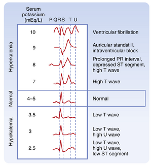 • 图36.2  不同血浆[K+]患者的心电图。详见正文。