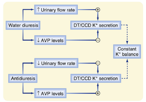 • 图36.8  AVP和尿流率对ASDN分泌K+的相反影响。K+分泌在尿流率增加时被刺激,而在AVP水平下降时减少。相反,K+分泌在尿流率减少时减少,而在AVP水平上升时增加。由于流率和AVP的影响相互抵消,净K+分泌不受水利尿或抗利尿剂的影响。AVP,精氨酸加压素;CCD,皮质集合管;DT, 远端小管。