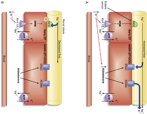 肾小管液流量的增加(例如,使用利尿剂治疗、ECF扩张)会在几分钟内刺激K+的分泌,而由出血、严重呕吐或腹泻引起的ECF收缩则会减少ASDN对K+的分泌。随着饮食中K+摄入量的增加,肾小管液流量的增加对刺激K+分泌的效果更为显著。流量的增加会使主细胞中的初级纤毛弯曲,从而激活多囊蛋白(PKD)1/PKD2 Ca++传导通道复合物。这使得更多的Ca++进入主细胞,并增加细胞内[Ca++]。[Ca++]的增加激活了顶膜上的BK K+通道,从而增强了K+从细胞向肾小管液的分泌。随着流量的增加,例如在使用利尿剂后或由于ECF的增加,肾小管液中的[Na+]也会增加。[Na+]的增加促进了Na+通过ASDN细胞顶膜的进入,从而降低了细胞内部的负膜电位。细胞膜电位的去极化增加了电化学驱动力,促进了K+通过顶膜向肾小管液的分泌。此外,Na+进入细胞的增加激活了基底外侧膜上的Na+,K+ -ATP酶,从而增加了K+通过基底外侧膜的摄取,进而提高了细胞内[K+]。需要注意的是,在水利尿期间流量的增加对K+的排泄没有显著影响,这很可能是因为在水利尿期间,肾小管液中的[Na+]不会随着流量的增加而增加。
