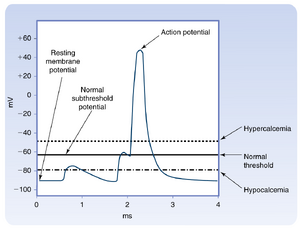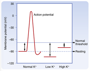 • 图36.1  血浆[K+]变化对骨骼肌静息膜电位的影响。高钾血症使膜电位负值减小,通过使快Na+通道失活(该通道负责动作电位的去极化时相)而降低兴奋性。低钾血症使膜电位超极化,从而降低兴奋性,因为需要更强的刺激才能使膜电位去极化达到阈电位。"静息"表示"正常"静息膜电位。"正常阈值"表示膜阈电位。