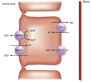 有机阳离子通过管腔膜进入小管液的转运过程是分泌过程的限速步骤,主要由电中性多药及毒素外排转运蛋白(multidrug and toxin extrusion transporters,MATEs)和MDR1(亦称P-糖蛋白)介导,其中MDR1的运作需要ATP供能。这些转运机制具有非特异性,多种有机阳离子通常通过同一转运通路竞争分泌。