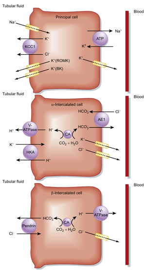 图34.9 远曲小管后段和集合管主细胞、α-间细胞(α-intercalated cells)及β-间细胞(β-intercalated cells)的转运通路。CA:碳酸酐酶(carbonic anhydrase)。主细胞重吸收Na+并分泌K+,K+通过两种钾通道(ROMK和BK)及K+/Cl-同向转运体(KCC1)分泌。α-间细胞分泌H+并重吸收HCO3-和K+,β-间细胞分泌HCO3-并重吸收H+和Cl-。