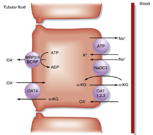 • 图34.5 近端小管有机阴离子(OA⁻)的分泌过程。OA⁻通过基底外侧膜上的三种OA⁻/α-酮戊二酸(α-KG)逆向转运机制(有机阴离子转运蛋白OAT1、OAT2、OAT3)进入细胞。α-KG逆化学浓度梯度进入细胞的驱动力来自Na⁺通过Na⁺-二羧酸转运蛋白(NaDC3)进入细胞的运动。由于基底外侧膜上的Na⁺,K⁺-ATP酶将Na⁺泵出细胞以交换K⁺,细胞内[Na⁺]维持低水平。α-KG通过OAT在基底外侧膜再循环,以交换OA⁻。OA⁻通过顶膜上的多药耐药蛋白(MRP2和4)及乳腺癌耐药蛋白(BCRP)离开细胞,这些过程需要ATP。顶膜上的OAT4可重吸收尿酸(一种有机阴离子)。