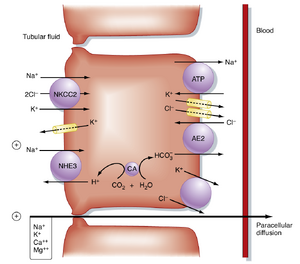 部分NaCl也通过细胞旁途径在近端小管后半段被重吸收。细胞旁路NaCl重吸收的发生是由于近端小管前半段管腔液中[Cl-]升高形成了浓度梯度(管腔140 mEq/L,间质105 mEq/L)。该浓度梯度促使Cl-通过紧密连接从管腔向细胞侧间隙扩散。带负电荷的Cl-移动导致管腔液相对血液呈正电性。这种正向跨上皮电压促使带正电的Na+通过紧密连接从管腔液向血液扩散。因此在近端小管后半段,部分Na+和Cl-通过被动扩散经紧密连接被重吸收。