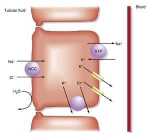 这些机制共同增强了顶膜对Na+的摄取,并促进Na+从细胞内转运至血液。Na+重吸收的增加使远曲小管后段和集合管产生跨上皮腔侧负电压。该负电压为Cl-通过紧密连接(tight junctions)的重吸收提供电化学驱动力。醛固酮还刺激ASDN分泌K+。