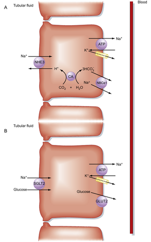近端小管重吸收约 67% 的水、Na+、Cl-、K+ 以及肾小球(glomerulus)滤过的大部分其他溶质。此外,近端小管几乎完全重吸收肾小球滤过的所有葡萄糖、蛋白质和氨基酸,以及大部分 HCO3-。近端小管重吸收的关键是基底外侧膜上的 Na+,K+-ATPase。所有物质(包括水)的重吸收都以某种方式与 Na+,K+-ATPase 的运作相关联。