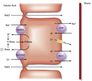 • 图34.3 近端小管后半段的钠离子转运过程。钠离子(Na⁺)和氯离子(Cl⁻)通过顶端膜上并行的Na⁺/H⁺(NHE3)交换体和Cl⁻-碱基(如甲酸根、草酸根和碳酸氢根)逆转运体(SLC26A6)进入细胞。该过程涉及多个Cl⁻-碱基逆转运体,但图中仅显示一个。分泌的H⁺和碱基在管腔液中结合形成H-碱基复合物,该复合物可通过质膜循环利用。管腔液中H-碱基复合物的积累形成H-碱基浓度梯度,促使H-碱基复合物从顶端质膜回收入细胞。在细胞内,H⁺和碱基解离并重新循环至顶端质膜。最终结果是NaCl通过顶端膜被摄取。碱基可以是氢氧根(OH⁻)、甲酸根(HCO₂⁻)、草酸根、HCO₃⁻或硫酸根。管腔内的正跨上皮电压(由管腔中圆圈内的加号表示)由Cl⁻(从管腔到血液)通过紧密连接扩散产生。管腔液中的高[Cl⁻]为Cl⁻扩散提供驱动力。部分葡萄糖在近端小管后半段的重吸收机制(未显示)与前半段类似,不同之处在于:钠-葡萄糖同向转运体(SGLT1基因)以2个Na⁺与1个葡萄糖的化学计量比进行转运,且相比图34.1所示的近端小管前半段钠-葡萄糖同向转运体具有更高的亲和力和更低的转运容量。此外,葡萄糖通过基底膜侧的GLUT1(而非前半段使用的GLUT2)离开细胞(未显示)。KCC表示K-Cl同向转运体。