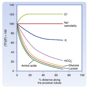 • 图34.2  小管液溶质浓度随近端小管长度变化的函数关系。TF/P表示小管液(tubular fluid)中某物质的浓度与血浆(plasma)中该物质浓度的比值。数值大于100表明该溶质相对于水的重吸收较少,数值小于100表明该溶质相对于水的重吸收较多。
