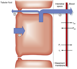 Starling力调节近端小管对NaCl和水的重吸收。如前所述,Na⁺、Cl⁻、HCO₃⁻、氨基酸、葡萄糖和水被转运至近端小管细胞间隙。该间隙与管周毛细血管之间的Starling力促使重吸收液进入毛细血管。作用于管周毛细血管壁的Starling力包括:管周毛细血管静水压(Pₚc)与侧向细胞间隙静水压(Pᵢ),以及管周毛细血管胶体渗透压(πₚc)与侧向细胞间隙胶体渗透压(πᵢ)。因此,Na⁺从管腔液转运至侧向细胞间隙所引起的水重吸收会受到Starling力的调节。具体公式如下: