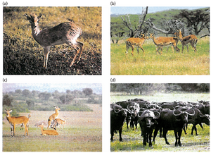 图9.3 哺乳动物交配系统多样性(以有蹄类为例)。(a) 柯氏犬羚Madoqua kirki实行单配制:雄性守卫一个雌性,可能因雌性活动范围过大无法守卫多个配偶。(b) 雄性黑斑羚Aepyceros melampus在发情期临时守卫雌性群。图中雄性正阻止三只雌性离开其领域。(c) 乌干达水羚Kobus kob thomasi雄性在求偶场守卫直径15-30\mathsf{m}的微型领域吸引雌性。图中中央雄性正与来访雌性交配。(d) 非洲水牛Syncerus caffer多个雄性伴随大雌群,在多雄群中竞争交配机会。