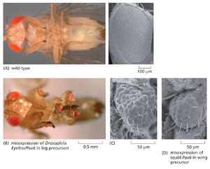 乍看之下,人们不会期望蠕虫、跳蚤、雄鹰和巨型乌贼由相同的发育机制产生,就如同不会假设制鞋与造飞机采用相同方法。然而令人惊讶的是,研究发现发育的基础机制在所有动物中本质上是一致的——不仅在所有脊椎动物中,在所有无脊椎动物中也是如此。相似的、进化相关的分子定义特化的动物细胞类型,标记不同身体区域的差异,并协助构建动物体型模式。同源蛋白在不同物种中常发挥相同作用且功能可互换。例如,人工在果蝇体内表达的小鼠或鱿鱼蛋白,能够执行与该果蝇自身版本蛋白相同的功能(图21-2)。基于机制的内在统一性,发育生物学家在系统理解动物发育方面取得了重大进展。