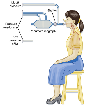 当使用体描计(body plethysmograph,body box,身体容积描记箱)测量肺容积时,波义耳气体定律——压力与体积的乘积为常数(在恒温条件下)——被用于计算肺容积。患者坐在一个气密箱中(图21.5),通过连接气流传感器(流速仪,pneumotach)的咬嘴进行呼吸。随后患者对着关闭的咬嘴进行急促呼吸动作。在此操作的呼气阶段,肺内气体被压缩,肺容积减少,而箱内压力因箱内气体体积增加而下降。已知箱体容积和口腔处箱压变化后,即可计算肺容积变化量(Δ V):