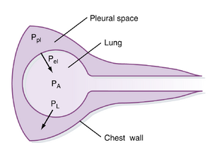 在健康人群中,肺和胸壁作为一个整体协同运动。这些结构之间存在胸膜腔(pleural space),在正常情况下最好将其视为潜在腔隙。由于肺和胸壁协同运动,吸气与呼气时它们的容积变化是相等的。肺和胸壁的容积变化由周围压力的变化驱动。根据惯例,肺和胸壁内部的压力以大气压为参照(大气压被视为0)。因此,胸膜腔内的负压是指低于大气压的压力。