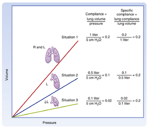 肺顺应性(compliance,CL)反映肺的弹性特性,表示肺被扩张的难易程度。其定义为:在扩张压改变1 cm H2O时引起的肺容积变化量。顺应性单位为毫升(或升)/厘米水柱。当肺顺应性高时,肺容易扩张;当顺应性低(肺"僵硬")时,肺难以扩张。肺顺应性CL可表示为: