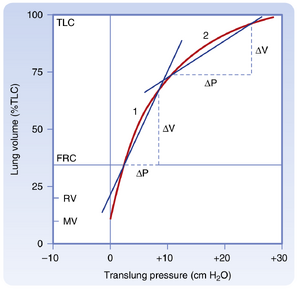 • 图21.8 呼气压力-容积曲线。患者吸气至肺总量(total lung capacity)后,使用食管气囊(测量胸膜压)测量跨肺压。随后患者缓慢呼气,在无气流且呼吸肌松弛时记录压力点。肺的压力-容积曲线在吸气(未显示)和呼气时并不重合,这种差异称为滞后现象(hysteresis),由表面活性物质作用所致。根据惯例,采用呼气压力-容积曲线进行测量。曲线上任意点的顺应性即单位压力变化引起的容积变化。该曲线显示肺顺应性随肺容积变化。在曲线上任取两点连线,其斜率即压力变化(ΔP)对应的容积变化(ΔV)。比较线1与线2的顺应性:线2斜率较线1平缓,说明高肺容积时顺应性低于低肺容积。根据惯例,肺顺应性指从功能残气量(FRC)到FRC+1升的跨压变化。MV:最小容积;RV:残气量;TLC:肺总量。