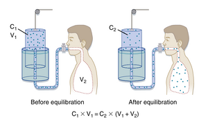 氦气稀释法的操作原理是:向已知容积(V1)的密闭容器内注入已知浓度(C1)的惰性气体(如氦气),随后将该容器连接至待测的未知容积(V2)(即待测肺容积)。待惰性气体充分分布后,测量其新浓度(C2)。通过惰性气体浓度的变化即可计算其分布的总容积(图21.4)。具体公式为:
