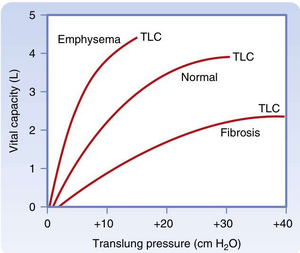 • 图21.1  正常与疾病状态下肺容积随跨肺压(transpulmonary pressure)变化的关系。跨肺压增大时,肺容积随之增加。图中同时显示了肺气肿(emphysema)和肺纤维化(pulmonary fibrosis)对肺容积的影响。需注意,在相同跨肺压变化下,这两种疾病导致的肺容积改变存在差异。TLC(总肺容量)指肺内气体总体积。
