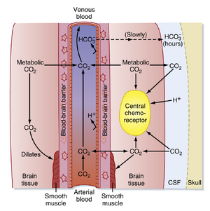 化学感受器(chemoreceptor)是指能够响应周围血液或其他体液化学成分变化的感受器。中枢化学感受器是位于延髓腹外侧表面的特化细胞。这些感受器对周围细胞外液的pH值变化敏感。由于该细胞外液与脑脊液(CSF)直接接触,CSF的pH值变化会通过作用于这些化学感受器来影响通气活动。