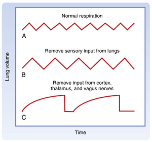 • 图25.10  几种呼吸模式。A、正常呼吸频率为每分钟12至20次。B、当不同肺受体(主要是牵张受体)的感觉传入被阻断时,每个呼吸周期延长且潮气量增加,但肺泡通气量未显著改变。C、当同时阻断来自大脑皮层和丘脑的传入信号及迷走神经传导时,会出现持续数秒的吸气活动,随后被短暂呼气中断(长吸呼吸,apneusis)。