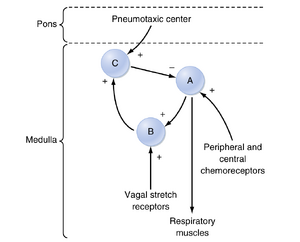 呼吸调节的主要调控部位包括:(1) 呼吸控制中心(respiratory control center),(2) 中枢化学感受器(central chemoreceptors),(3) 外周化学感受器(peripheral chemoreceptors),以及(4) 肺机械感受器/感觉神经(pulmonary mechanoreceptors/sensory nerves)。呼吸控制中心位于脑干的延髓(medulla oblongata),由多个产生和调节基本呼吸节律的核团组成。该中心包含两个主要部分:(1) 通气模式发生器(ventilatory pattern generator),负责设定节律模式;(2) 整合器(integrator),负责控制模式的生成、处理来自高位脑中枢和化学感受器的输入信号,并调节通气模式的速率和幅度。整合器的输入信号源自高位脑中枢,包括大脑皮层、下丘脑、杏仁核所在的边缘系统以及小脑。