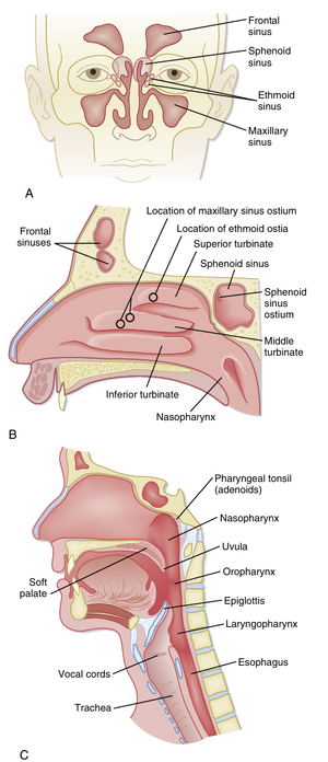 图20.1 上呼吸道解剖结构示意图 A. 鼻旁窦前面观 B. 鼻道结构侧面观,显示上、中、下鼻甲及鼻窦开口 C. 头颈部正中矢状切面观,显示咽的三个分区(鼻咽、口咽和喉咽)及周围上呼吸道结构