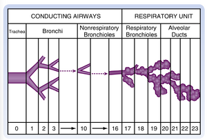 • 图20.4 肺传导性气道与肺泡单位示意图。肺泡单位的相对尺寸被大幅放大。底部数字表示从气管到肺泡的大致分支级数,可能从10级至23级不等。(引自Weibel ER. Morphometry of the Human Lung. Heidelberg: Springer-Verlag; 1963.)