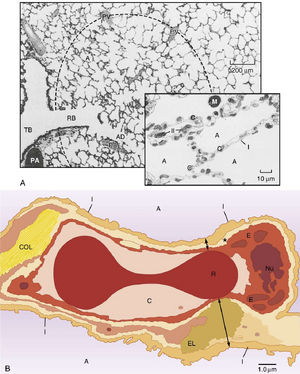 • 图20.6  肺泡结构。A,终末呼吸单元由肺泡(A)和源自呼吸性细支气管(RB)的肺泡管(AD)组成。如虚线轮廓所示,每个单元大致呈球形。肺静脉血管(PV)位于外周。PA,肺动脉;TB,终末细支气管。插图示I型和II型肺泡上皮细胞。肺泡壁大部分由毛细血管(C)及其内容物构成。B,肺泡壁横截面示意图,显示O₂和CO₂的扩散路径。肺泡壁屏障薄侧(短双箭头)由I型上皮(I)、上皮细胞与内皮细胞融合基底层形成的间质(星号)、毛细血管内皮(E)、肺泡毛细血管(C)中的血浆及红细胞(R)胞质组成。气体交换屏障厚侧(长双箭头)积聚着弹性蛋白(EL)、胶原蛋白(COL)和基质,共同分隔肺泡上皮与肺泡毛细血管内皮。Nu,毛细血管内皮细胞核。