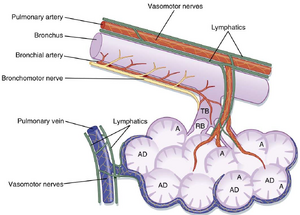 支气管循环(Bronchial circulation)是一个独立于肺循环(pulmonary circulation)的独特系统,负责向气管、支气管树、表面分泌细胞、腺体、神经、脏层胸膜表面、淋巴结、肺动脉和肺静脉提供含氧的体循环动脉血。支气管循环在结构上与体循环系统相似,主要灌注上呼吸道;其分布不延伸至终末细支气管(terminal bronchioles)、呼吸性细支气管(respiratory bronchioles)或肺泡。来自支气管循环毛细血管的静脉血通过真支气管静脉(true bronchial veins)或支气管肺静脉(bronchopulmonary veins)回流至心脏。真支气管静脉存在于肺门区域,血液经奇静脉(azygos)、半奇静脉(hemiazygos)或肋间静脉(intercostal veins)流入右心房支气管肺静脉由支气管循环和肺循环血管的吻合支网络形成,其中混合了来自两个循环系统的血液。这些吻合血管的血液通过肺静脉返回左心房。约三分之二的支气管循环总血量通过肺静脉和该吻合途径回流至心脏。