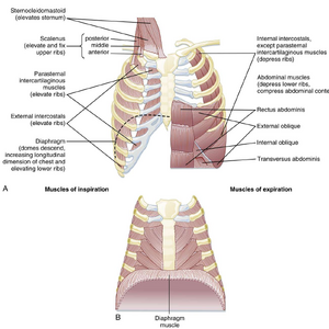 但在运动时这些肌肉会强力收缩,当气道显著阻塞时,它们会主动上提胸廓。正常呼吸时,它们负责固定胸骨和上肋。由于上呼吸道在吸气时必须保持开放状态,咽壁肌肉(颏舌肌和杓状肌)也被视为吸气肌。所有胸廓肌肉均为随意肌,由肋间动脉和静脉供血,并受肋间运动神经和感觉神经支配。