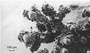 • 图20.5 从终末细支气管到肺泡的气道结构。注意终末细支气管内无肺泡。A,肺泡;RB,呼吸性细支气管;TB,终末细支气管。
