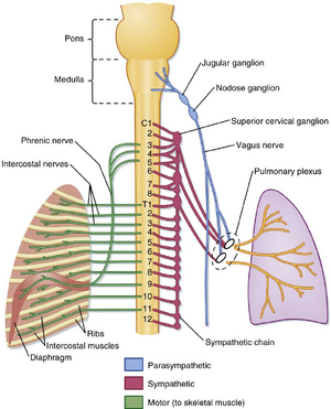 5. 呼吸是自主过程;肺受周围神经系统(PNS)的自主神经支配,同时受中枢神经系统(CNS)调控。副交感神经刺激导致气道平滑肌收缩(气道狭窄),而交感神经刺激导致气道平滑肌舒张(气道扩张)。