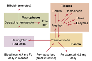 由于铁不仅对血红蛋白的形成重要,还对体内其他必需元素(如肌红蛋白(myoglobin)、细胞色素(cytochromes)、细胞色素氧化酶(cytochrome oxidase)、过氧化物酶(peroxidase)和过氧化氢酶(catalase))的形成也很重要,因此了解铁在体内的利用方式非常重要。体内铁的总量平均为4到5克,其中约65%以血红蛋白的形式存在。约4%以肌红蛋白的形式存在,1%以促进细胞内氧化的各种血红素化合物的形式存在,0.1%与血浆中的转铁蛋白(transferrin)结合,15%到30%以铁蛋白(ferritin)的形式储存,主要在网状内皮系统(reticuloendothelial system)和肝实质细胞(liver parenchymal cells)中。