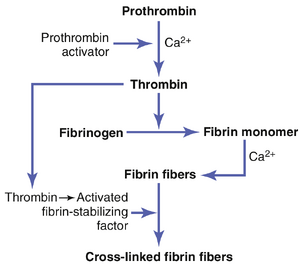 - 激活的因子X形成凝血酶原激活物(prothrombin activator)的作用——因子V的作用。内源性途径(intrinsic pathway)中的这一步与外源性途径(extrinsic pathway)的最后一步相同。也就是说,激活的因子X与因子V以及血小板或组织磷脂结合,形成称为凝血酶原激活物的复合物。凝血酶原激活物反过来在几秒钟内启动凝血酶原(prothrombin)的裂解,形成凝血酶(thrombin),从而启动最终的凝血过程,如前所述。