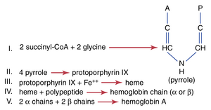 图33-6. 血红素部分的基本结构,显示了四条血红素链中的一条,它们与珠蛋白多肽(globin polypeptide)一起结合形成血红蛋白分子。