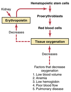 各种减少组织血流的循环系统疾病,特别是那些导致血液通过肺部时氧气吸收失败的疾病,也会增加红细胞的生成速率。这种结果在长期心脏衰竭和许多肺部疾病中尤为明显,因为这些情况导致的组织缺氧会增加红细胞的生成,从而导致血细胞比容(hematocrit)和通常总血量的增加。
