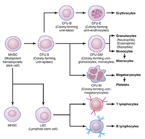当不同的定向干细胞在培养中生长时,会产生特定类型血细胞的集落。产生红细胞的定向干细胞称为红细胞集落形成单位(colony-forming unit-erythrocyte),缩写为CFU-E。同样,形成粒细胞和单核细胞的集落形成单位被命名为CFU-GM,依此类推。