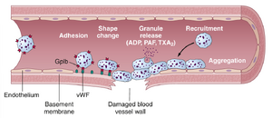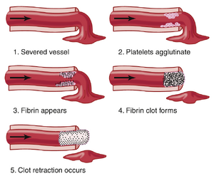 - 血液创伤导致(1)因子Xll的激活和(2)血小板磷脂的释放。血液创伤或血液暴露于血管壁胶原蛋白会改变血液中的两个重要凝血因子:因子XII和血小板。当因子XII受到干扰时,例如通过与胶原蛋白或玻璃等可湿润表面接触,它会采取新的分子构型,将其转化为称为激活因子XII的蛋白水解酶。同时,血液创伤也会因血小板粘附于胶原蛋白或可湿润表面(或以其他方式受损)而损伤血小板;这会释放含有称为血小板因子3的脂蛋白的血小板磷脂,该脂蛋白在随后的凝血反应中也起作用。