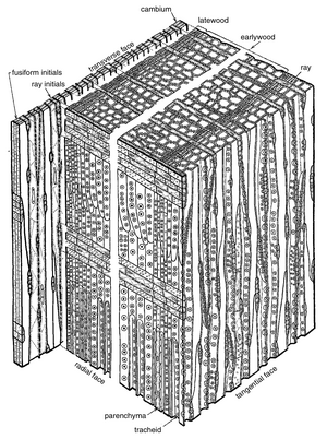 通过形成层原始细胞的切向分裂在形成层内表面产生的衍生细胞在发育成木质部的各种元素时经历了复杂的变化。次生木质部的基本模式,包括其轴向和径向系统,是由形成层本身的结构决定的,因为形成层由纺锤形原始细胞和射线原始细胞组成。此外,这两个系统之间相对比例的所有变化——例如,射线的增加或消除(第12章)——都起源于形成层。
