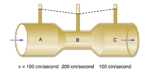 流速、流量与横截面积之间的关系如图17.1所示。由于质量守恒定律要求流经刚性管道的流体总量恒定,因此流体的流速与横截面积成反比。即流体流速在横截面积最小的管段最大,而在横截面积最大的管段最慢。