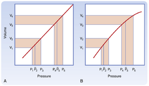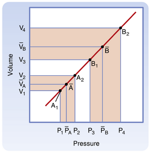 • 图 17.2  在管道的狭窄部分(B)中,线性速度(linear velocity,v)及其对应的压力动态分量(dynamic component of pressure,ρV²/2)均大于同一管道的宽大部分(A和C)。若总能量在整个管道中基本恒定(即因黏性导致的能量损失可忽略不计),则狭窄部分的侧压(lateral pressure)低于宽大部分的侧压(通过比较隔室A、B和C上方液柱高度可反映压力差异)。