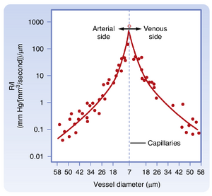 图 17.4  单个小血管单位长度的阻力(R/l)。直径为 7μm 的毛细血管由垂直虚线标出。小动脉的阻力绘制于垂直虚线左侧,小静脉的阻力绘制于右侧。对于这两种血管,单位长度的阻力与血管直径的四次方成反比。