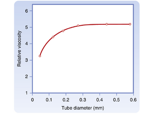 对于任何给定的血细胞比容,血液表观粘度取决于测量所用管道的尺寸。图17.8显示当管径减小至约0.3毫米以下时,血液表观粘度持续降低。具有最大血流阻力的血管(微动脉(arterioles))管径远小于该临界值,这种现象反而降低了高阻力血管中的血流阻力。管径对表观粘度的影响部分源于血液流经小管时成分的实际变化:红细胞倾向于聚集在流速更快的中心流层,而血浆则多分布于流速较慢的边缘层。由于血流中心区域红细胞比例更高且流速更快,红细胞通过管道的时间短于血浆。此外,小血管中的血细胞比容值低于大动脉或静脉中的血液。