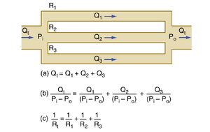 对于图17.6所示的并联阻力,所有管道的流入压和流出压相同。在稳态下,系统的总流量(Q)等于通过各并联单元的流量之和(图17.5中的方程[a])。由于压力梯度(Pi-Po)对所有并联单元相同,方程(a)中的每项均可除以该压力梯度得到方程(b)。根据阻力定义,可推导出图17.5中的方程(c)。该方程表明:对于并联排列的阻力,总阻力(Rt)的倒数等于各阻力倒数之和,即: